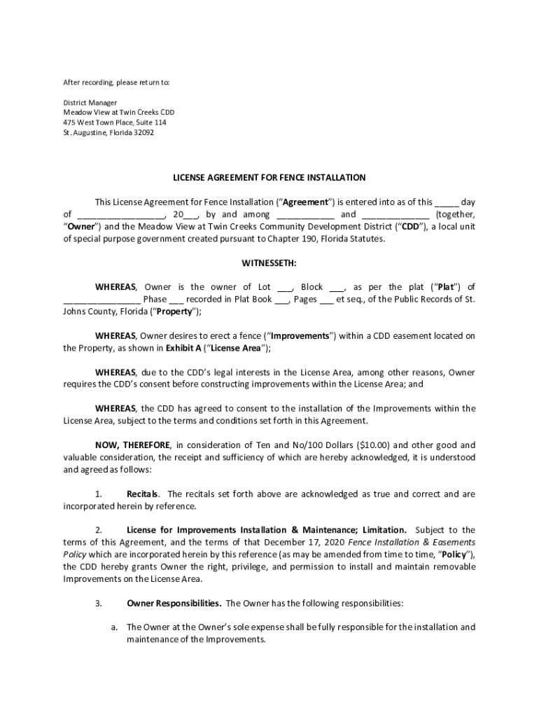 After recording, please return to: District Manager Meadow View at Twin Creeks CDD 475 West Town Place, Suite 114 St. Augustine, Florida 32092LICENSE AGREEMENT FOR FENCE INSTALLATION This License