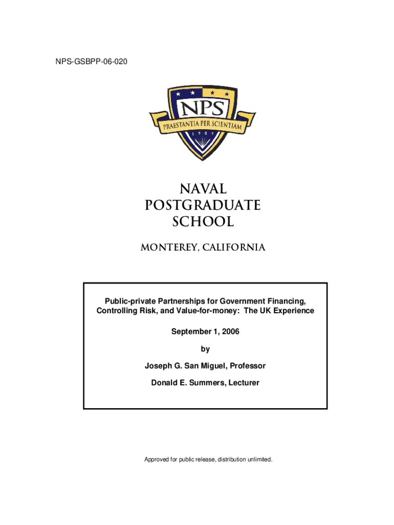 NPSGSBPP06020 k^s^i mlpqdo^ar^qb p`elli jlkqbobvI`^ifclokf^ Publicprivate Partnerships for Government Financing, Controlling Risk, and Valueformoney: The UK Experience September 1, 2006 by Joseph