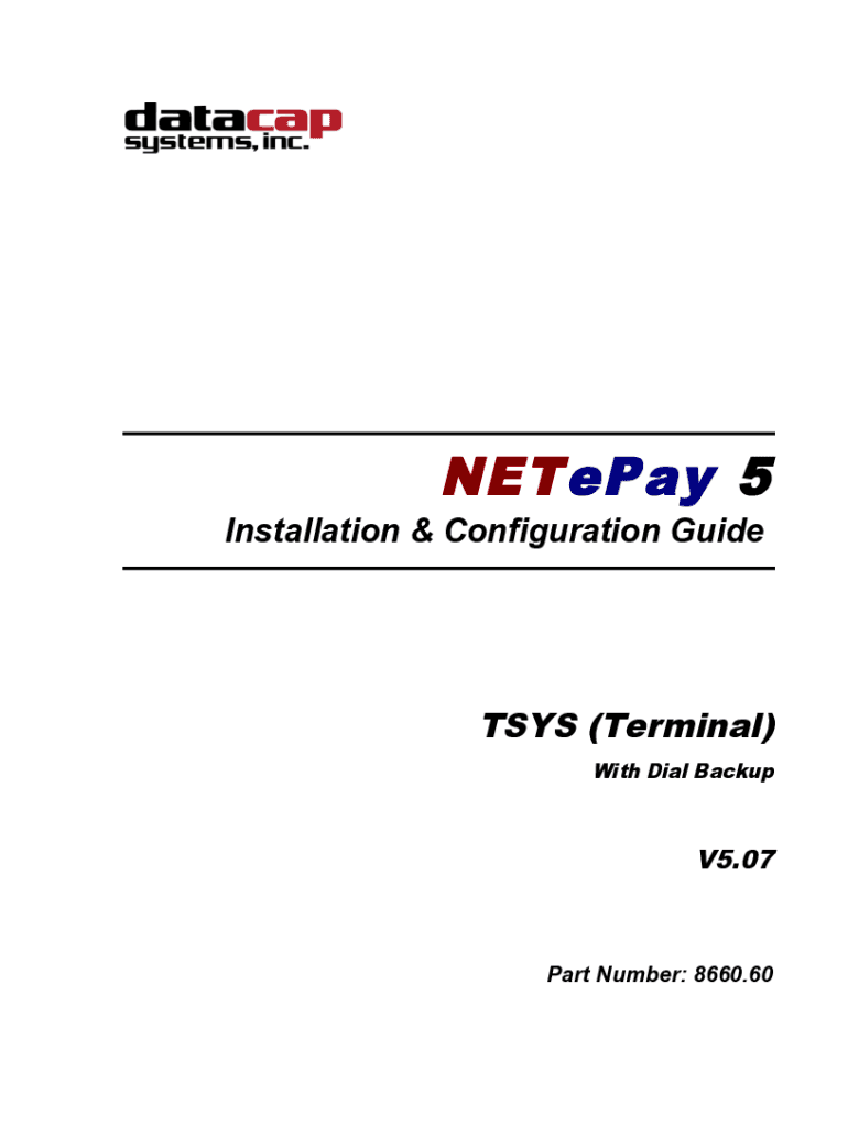 NETePay 5 Installation & Configuration GuideTSYS (Terminal) With Dial BackupV5.07Part Number: 8660.60NETePay Installation & Configuration Guide Copyright 2006 2018 Datacap Systems Inc. All rights