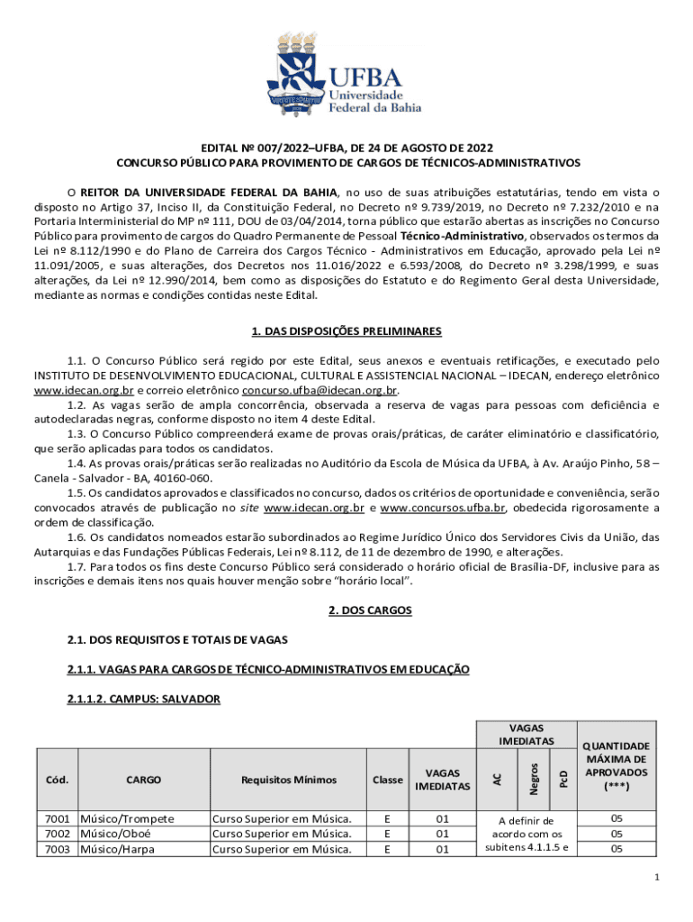 EDITAL N 007/2022UFBA, DE 24 DE AGOSTO DE 2022 CONCURSO PBLICO PARA PROVIMENTO DE CARGOS DE TCNICOSADMINISTRATIVOS O REITOR DA UNIVERSIDADE FEDERAL DA BAHIA, no uso de suas atribuies estatutrias,