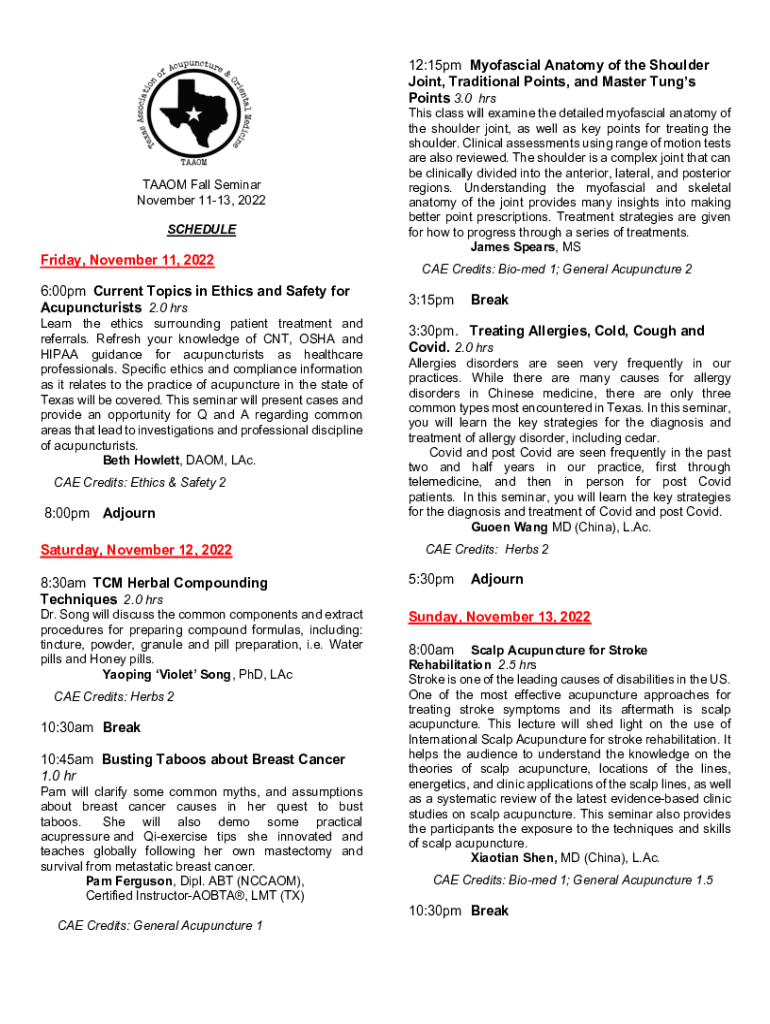 12:15pm Myofascial Anatomy of the Shoulder Joint, Traditional Points, and Master Tungs Points 3.0 hrsTAAOM Fall Seminar November 1113, 2022 SCHEDULEFriday, November 11, 2022 6:00pm Current Topics