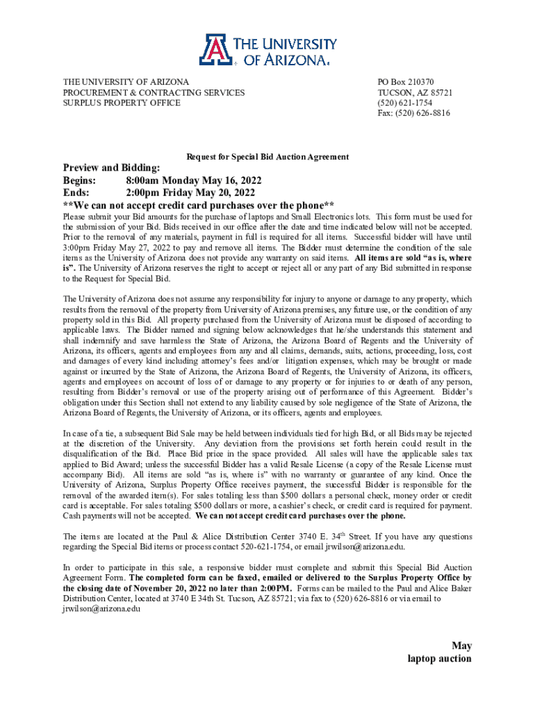 THE UNIVERSITY OF ARIZONA PROCUREMENT & CONTRACTING SERVICES SURPLUS PROPERTY OFFICEPO Box 210370 TUCSON, AZ 85721 (520) 6211754 Fax: (520) 6268816Request for Special Bid Auction AgreementPreview