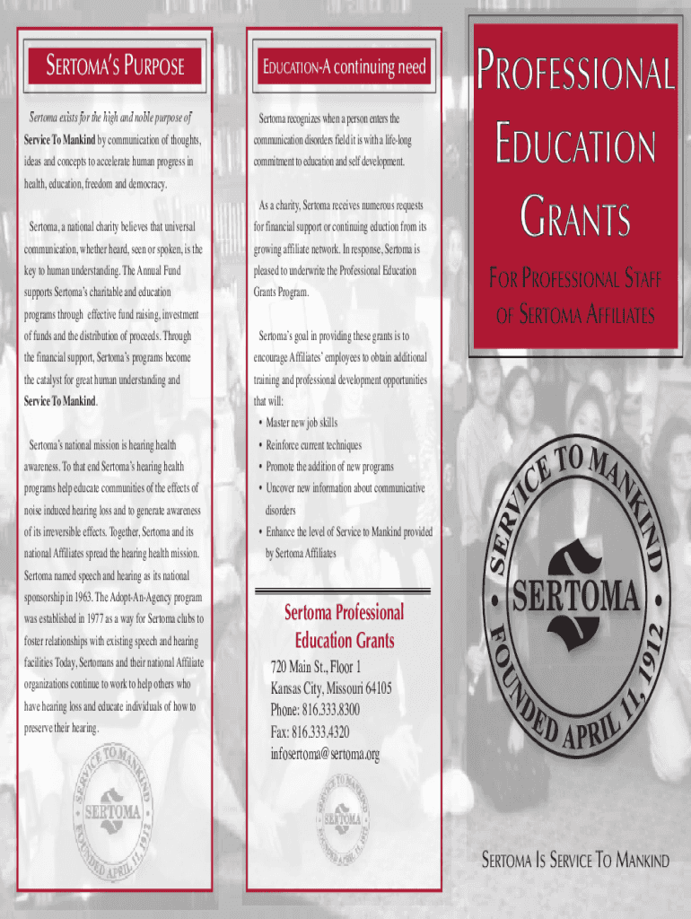 SERTOMAS PURPOSE Sertoma exists for the high and noble purpose ofService To Mankind by communication of thoughts, ideas and concepts to accelerate human progress in health, education, freedom and