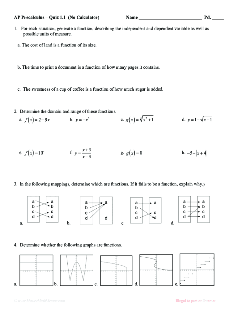 AP Precalculus Quiz 1.1 (No Calculator)Name ___ Pd. ___1. For each situation, generate a function, describing the independent and dependent variable as well as possible units of measure. a. The cost