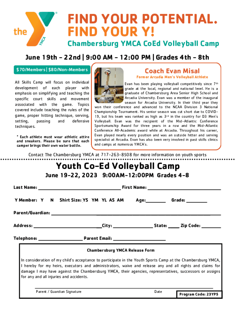 FIND YOUR POTENTIAL. FIND YOUR Y!Chambersburg YMCA CoEd Volleyball Camp June 19th 22nd | 9:00 AM 12:00 PM | Grades 4th 8th Coach Evan Misal$70/Members | $80/NonMembersFormer Arcadia Mens Volleyball