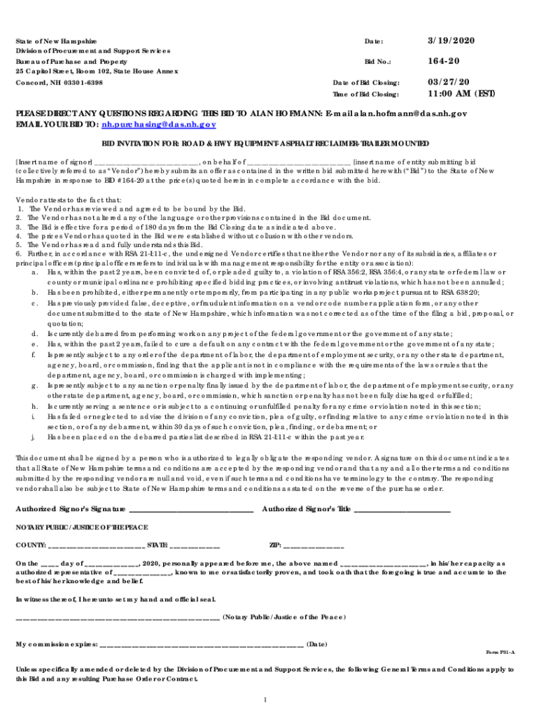 State of New Hampshire Division of Procurement and Support ServicesDate:3/19/2020Bureau of Purchase and Property 25 Capitol Street, Room 102, State House AnnexBid No.:16420Concord, NH 033016398Date