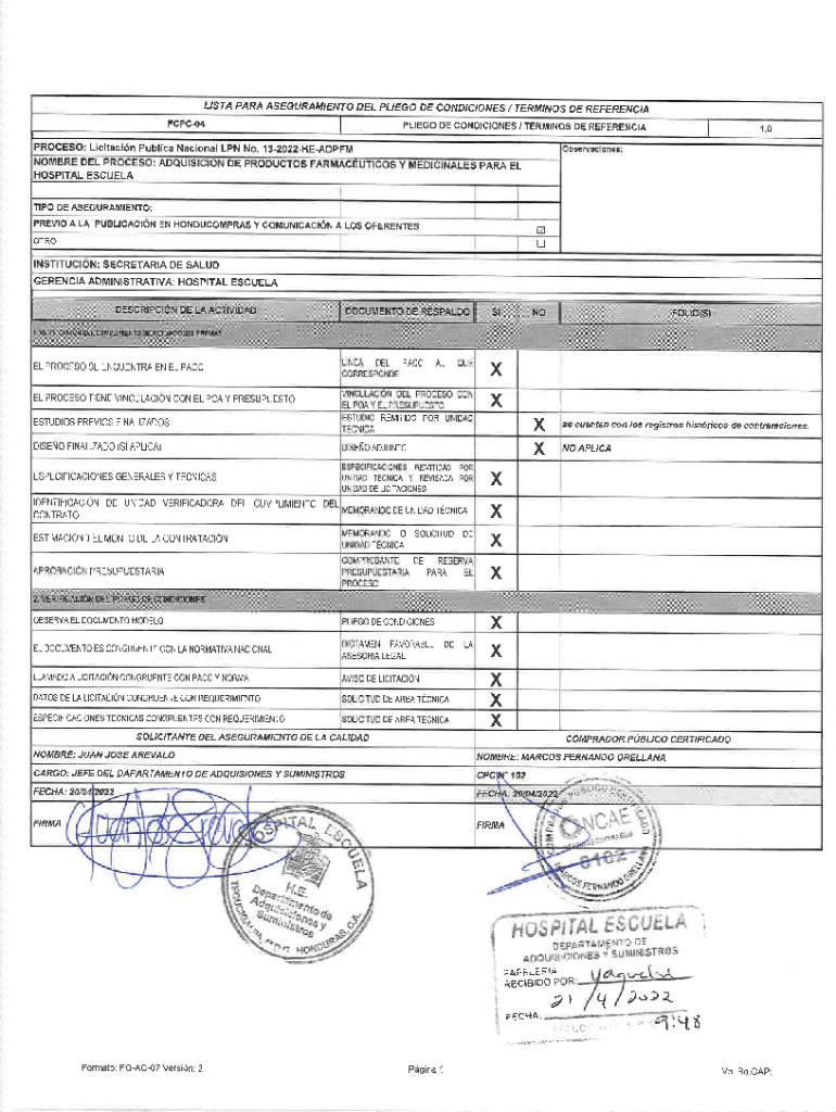 PLIEGO DE CONDICIONES PARA LA LICITACIN PBLICA NACIONAL (LPN) No. No.132022HEADPFM ADQUISICIN DE PRODUCTOS FARMACUTICOS Y MEDICINALES PARA EL HOSPITAL ESCUELAFuente de Financiamiento: Fondos SEFINHONDURAS/