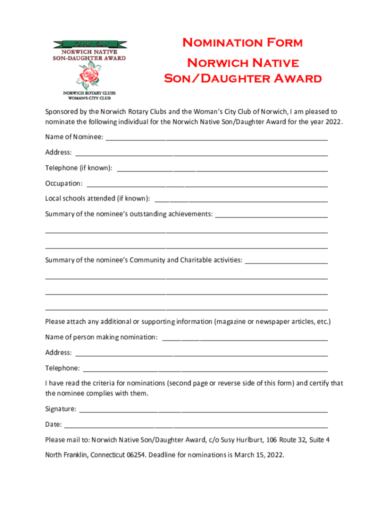 Nomination Form Norwich Native Son/Daughter Award Sponsored by the Norwich Rotary Clubs and the Womans City Club of Norwich, I am pleased to nominate the following individual for the Norwich Native