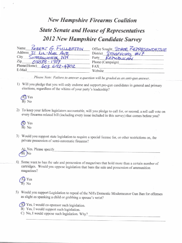 New Hampshire Firearms Coalition State Senute qnd House of Representutives2012 New Hampshire Candidate Survey Name AddresszipOffice District Party Phone (Campaign)Phone(Home)FAXEMailWebsiteCityPlease