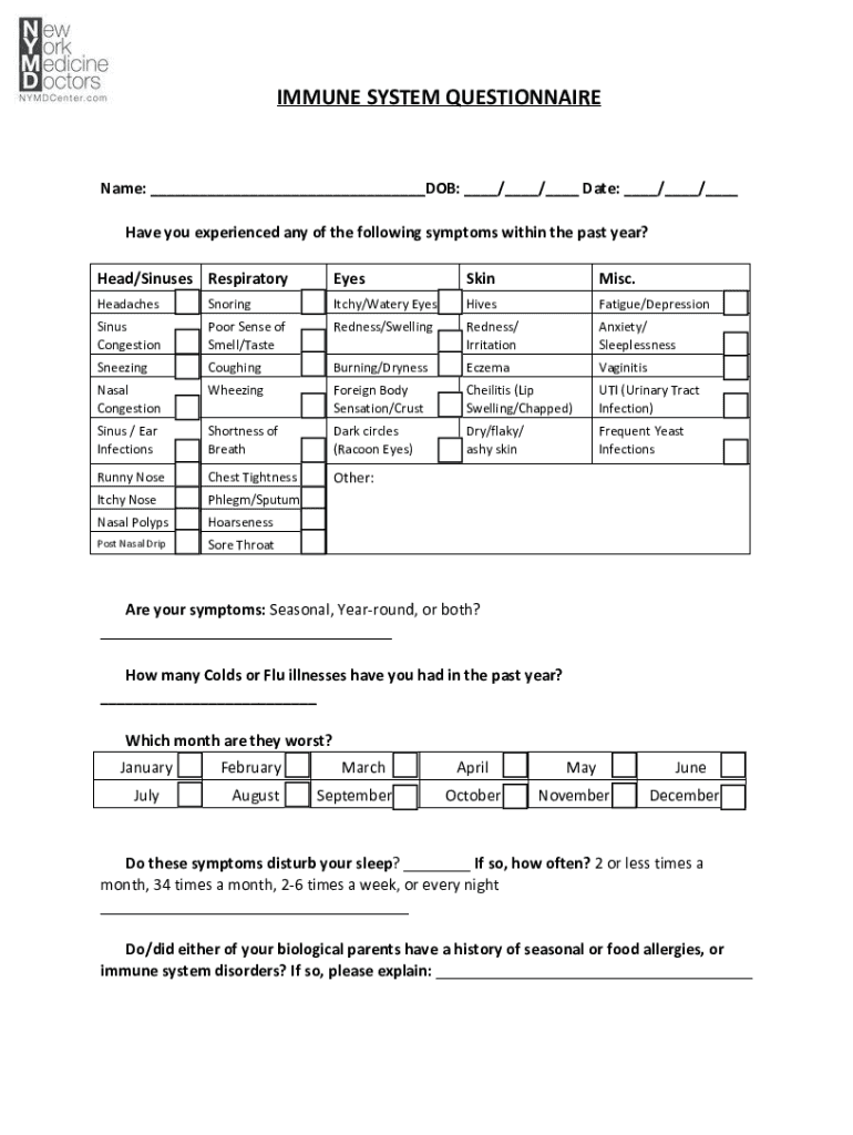 IMMUNE SYSTEM QUESTIONNAIREName: ___DOB: ___/___/___ Date: ___/___/___ Have you experienced any of the following symptoms within the past year? Head/Sinuses RespiratoryEyesSkinMisc.HeadachesSnoringItchy/Watery