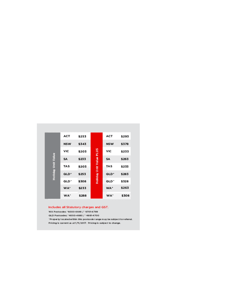 ACT$263NSW$303VIC$253SA$228TAS$223QLD*$263QLD^$318WA*$228WA^$258Landlords Extra Protection Value PLUSLandlords Extra Protection ValueFor AgentManaged PropertyACT$303NSW$343VIC$283SA$258TAS$253QLD*$293QLD^$348WA*$258WA^$313ACT$253ACT$293NSW$343NSW$378VIC$203VIC$233SA$233SA$263TAS$203TAS$233QLD*$253QLD*$283QLD^$308QLD^$328WA*$233WA*$263WA^$288WA^$308Holiday