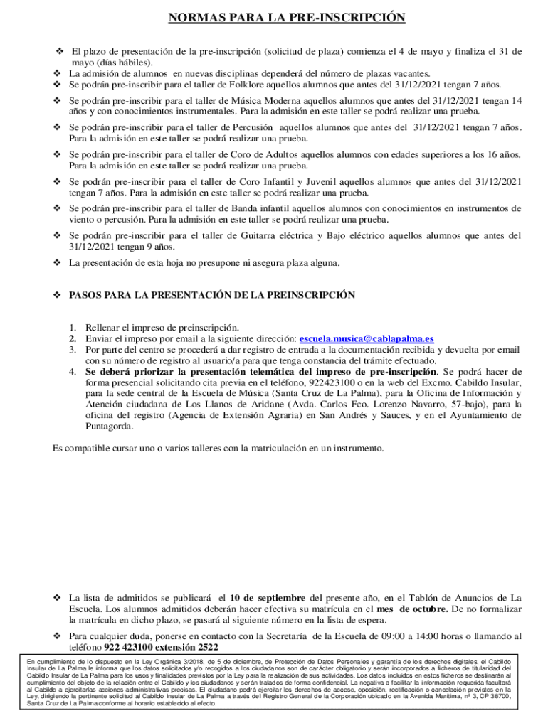 NORMAS PARA LA PREINSCRIPCIN El plazo de presentacin de la preinscripcin (solicitud de plaza) comienza el 4 de mayo y finaliza el 31 de mayo (das hbiles). La admisin de alumnos en nuevas disciplinas