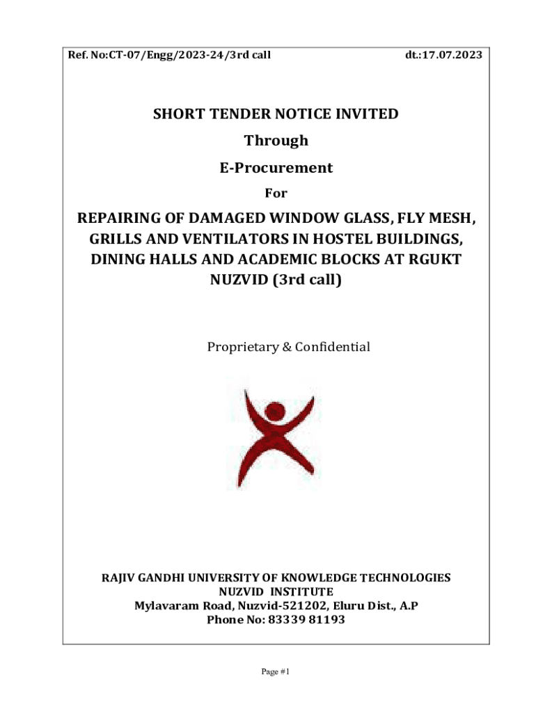 Ref. No:CT07/Engg/202324/3rd calldt.:17.07.2023SHORT TENDER NOTICE INVITED Through EProcurement ForREPAIRING OF DAMAGED WINDOW GLASS, FLY MESH, GRILLS AND VENTILATORS IN HOSTEL BUILDINGS, DINING HALLS