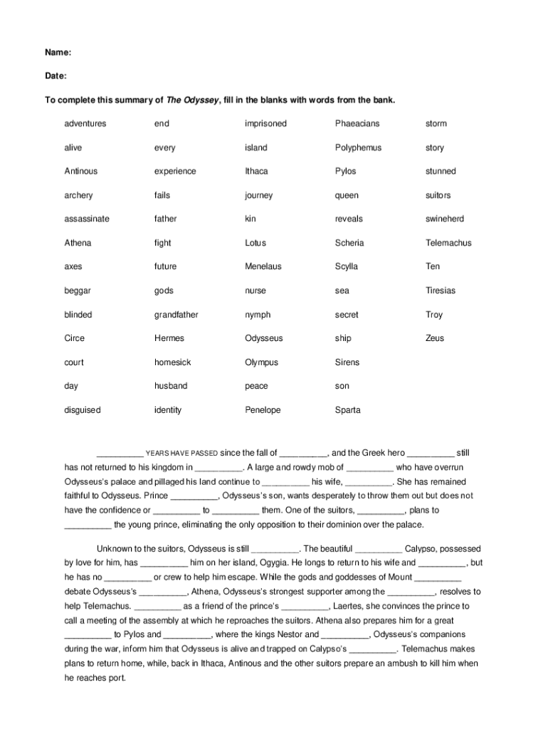 Name: Date: To complete this summary of The Odyssey, fill in the blanks with words from the bank. adventuresendimprisonedPhaeaciansstormaliveeveryislandPolyphemusstoryAntinousexperienceIthacaPylosstunnedarcheryfailsjourneyqueensuitorsassassinatefatherkinrevealsswineherdAthenafightLotusScheriaTelemachusaxesfutureMenelausScyllaTenbeggargodsnurseseaTiresiasblindedgrandfathernymphsecretTroyCirceHermesOdysseusshipZeuscourthomesickOlympusSirens