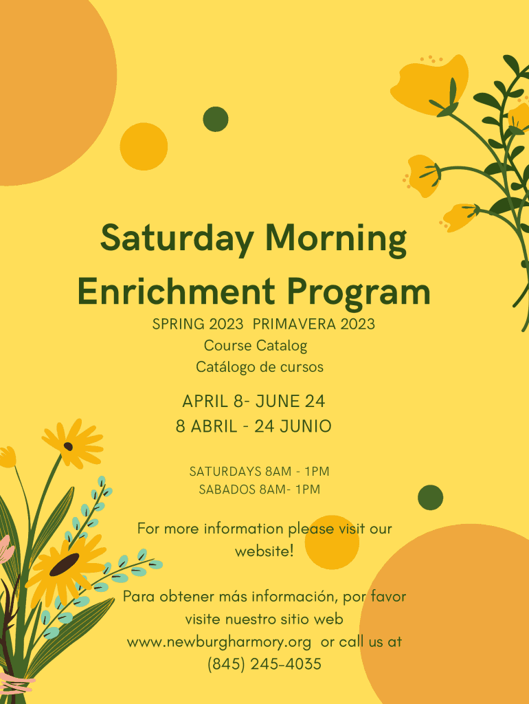 Saturday Morning Enrichment Program SPRING 2023 PRIMAVERA 2023 Course Catalog Catlogo de cursosAPRIL 8 JUNE 24 8 ABRIL 24 JUNIO SATURDAYS 8AM 1PM SABADOS 8AM 1PMFor more information please visit our