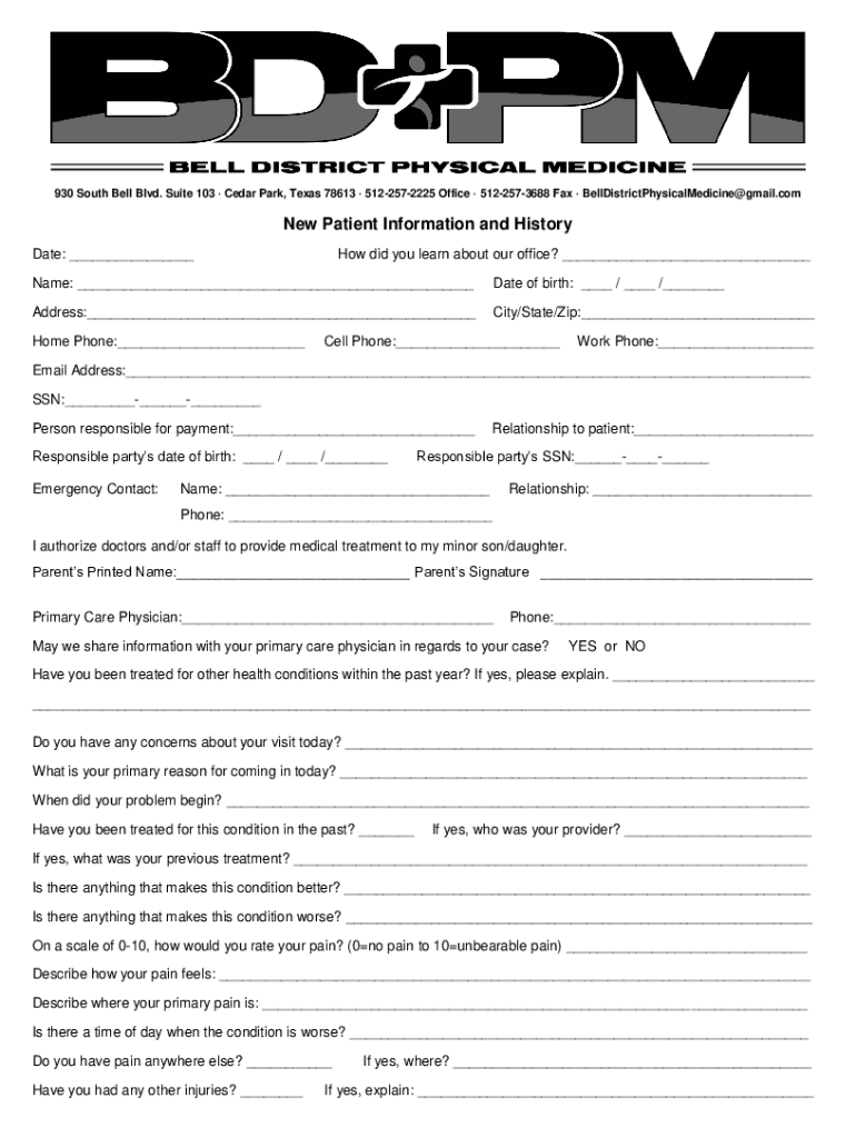 930 South Bell Blvd. Suite 103 Cedar Park, Texas 78613 5122572225 Office 5122573688 Fax BellDistrictPhysicalMedicine@gmail.comNew Patient Information and History Date: ___How did you learn about our