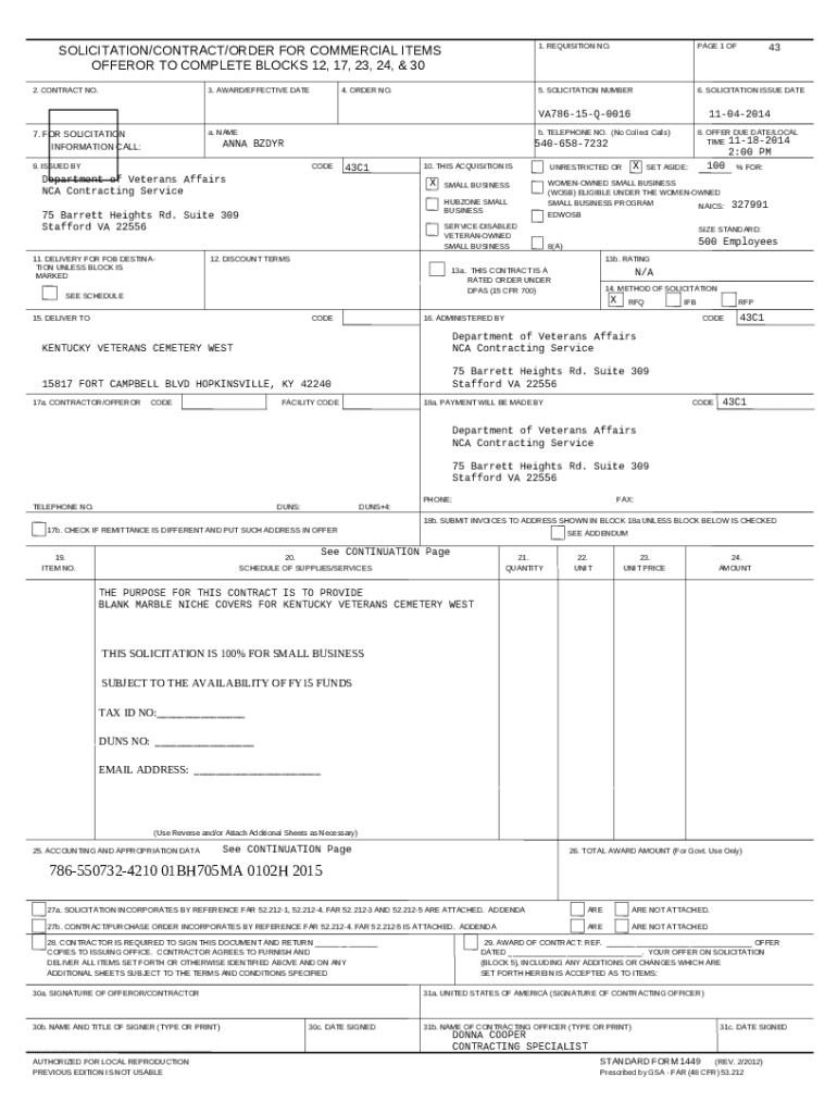 The THIS SOLICITATION IS 100% FOR SMALL BUSINESS is a writable document which can be completed and signed for certain reasons. Then, it is provided to the exact addressee in order to provide some information of any kinds. The completion and signing is able in hard copy or via a suitable service e. g. PDFfiller. Such services help to send in any PDF or Word file online. It also allows you to edit it depending on your needs and put a valid e-signature. Once finished, the user ought to send the THIS SOLICITATION IS 100% FOR SMALL BUSINESS to the respective recipient or several ones by email or fax. PDFfiller has a feature and options that make your document of MS Word extension printable. It offers various settings when printing out. It does no matter how you'll send a document - physically or by email - it will always look well-designed and organized. In order not to create a new file from the beginning again and again, make the original Word file as a template. Later, you will have a rewritable sample.