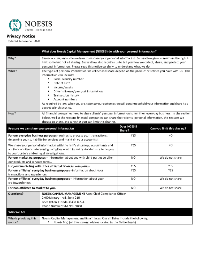 Privacy NoticeUpdated: November 2020What does Noesis Capital Management (NOESIS) do with your personal information? Why? What?Financial companies choose how they share your personal information. Federal
