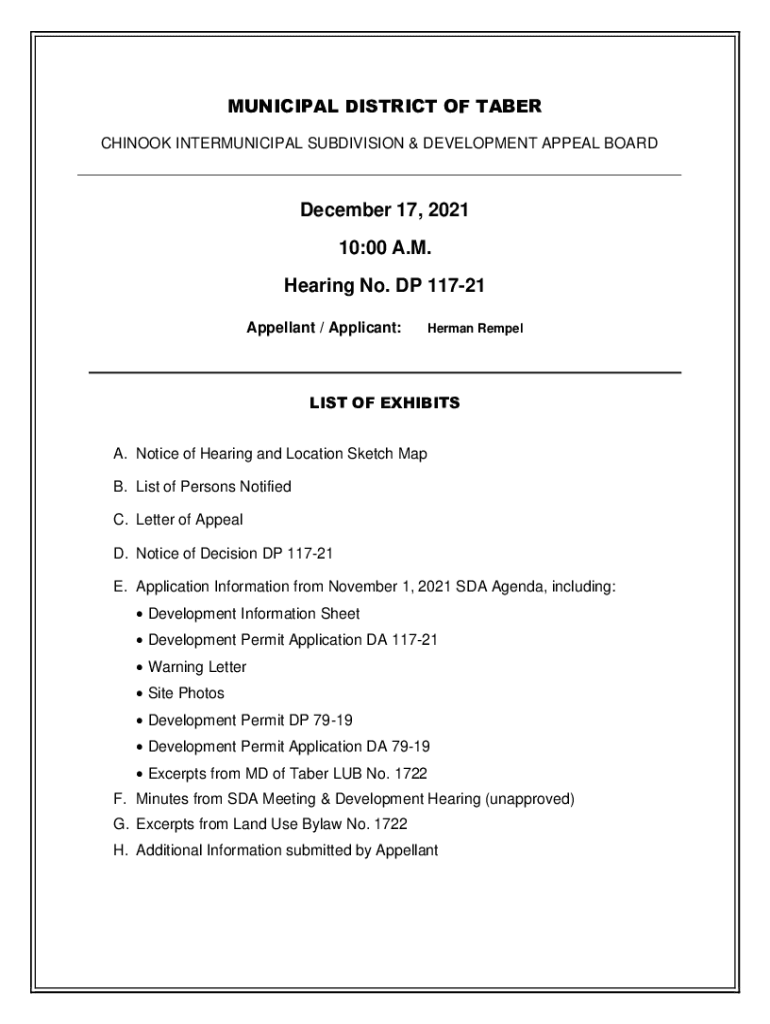 MUNICIPAL DISTRICT OF TABER CHINOOK INTERMUNICIPAL SUBDIVISION & DEVELOPMENT APPEAL BOARDDecember 17, 2021 10:00 A.M. Hearing No. DP 11721 Appellant / Applicant:Herman RempelLIST OF EXHIBITS A. Notice
