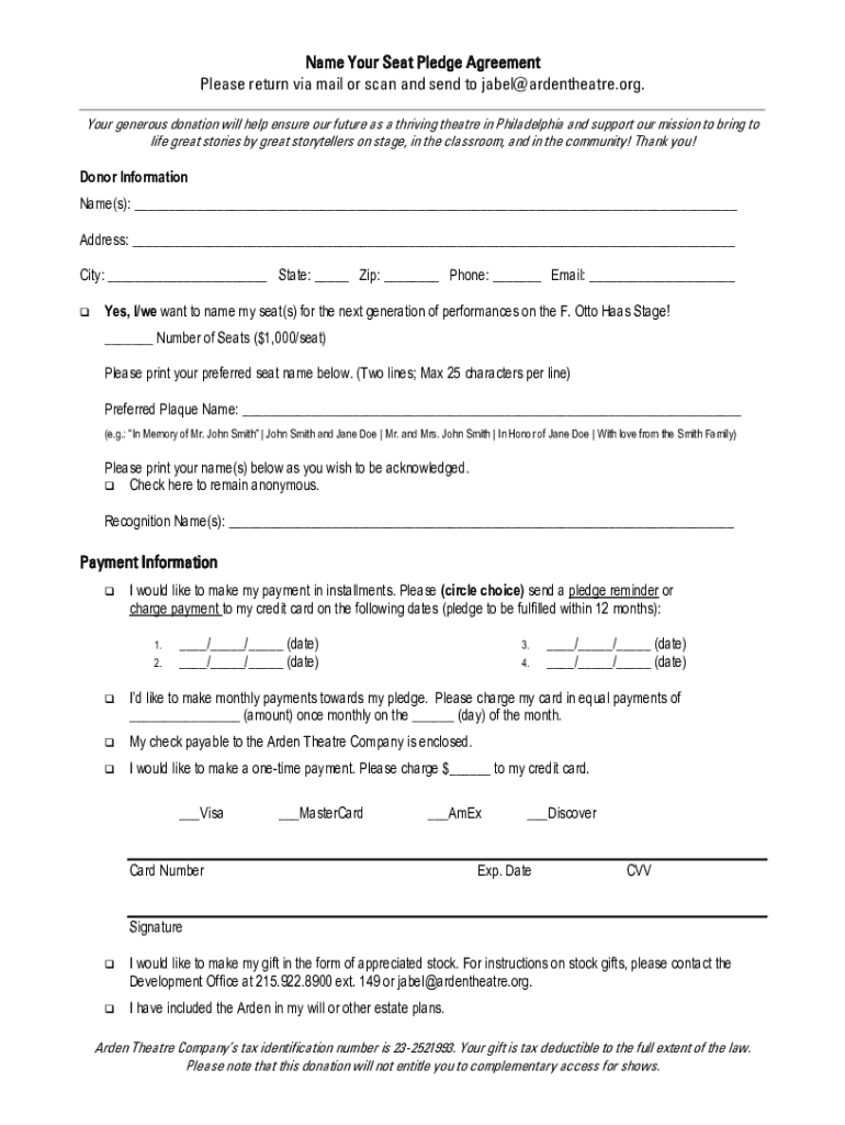 Name Your Seat Pledge Agreement Please return via mail or scan and send to jabel@ardentheatre.org. Your generous donation will help ensure our future as a thriving theatre in Philadelphia and support