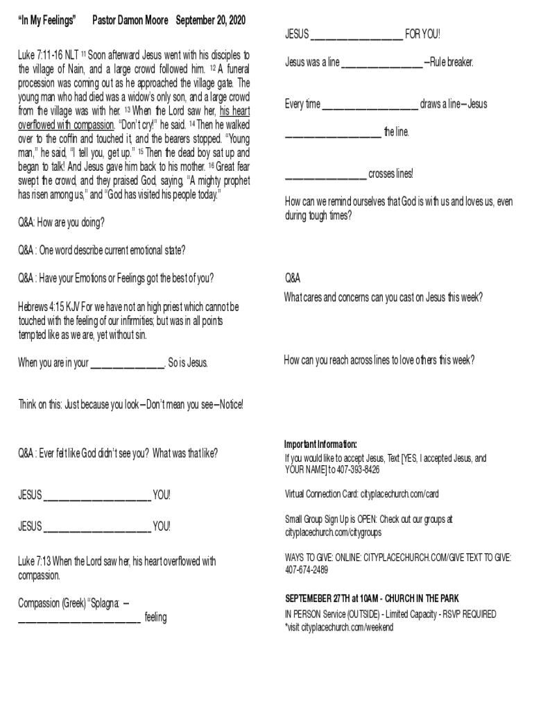 In My FeelingsPastor Damon MooreSeptember 20, 2020Luke 7:1116 NLT 11 Soon afterward Jesus went with his disciples to the village of Nain, and a large crowd followed him. 12 A funeral procession was