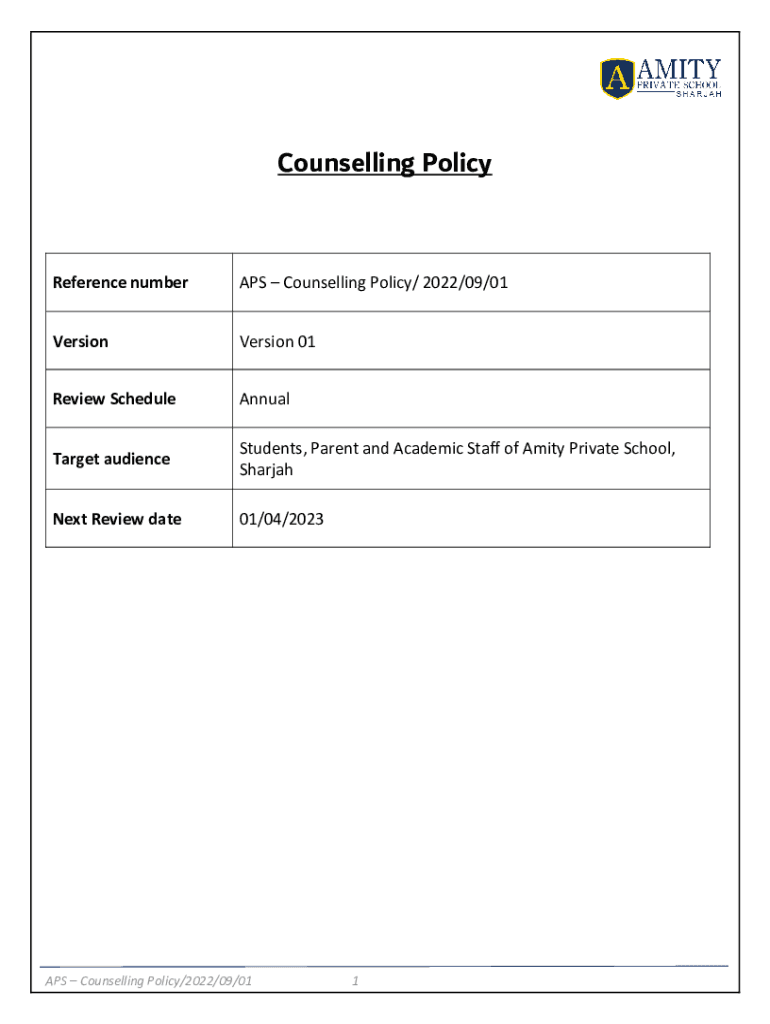 Counselling PolicyReference numberAPS Counselling Policy/ 2022/09/01VersionVersion 01Review ScheduleAnnualTarget audienceStudents, Parent and Academic Staff of Amity Private School, SharjahNext Review