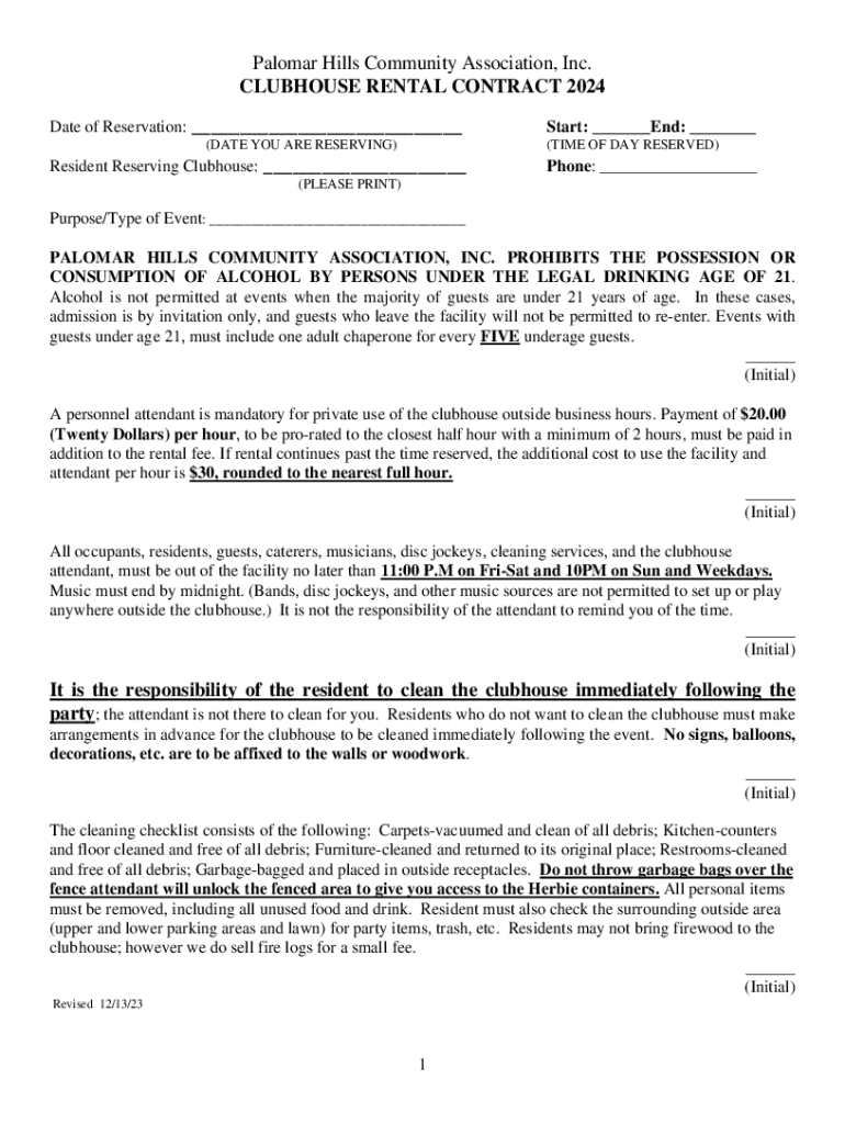 Palomar Hills Community Association, Inc. CLUBHOUSE RENTAL CONTRACT 2024 Date of Reservation: ___ (DATE YOU ARE RESERVING)Start: ___End: ___ (TIME OF DAY RESERVED)Resident Reserving Clubhouse: ___Phone: