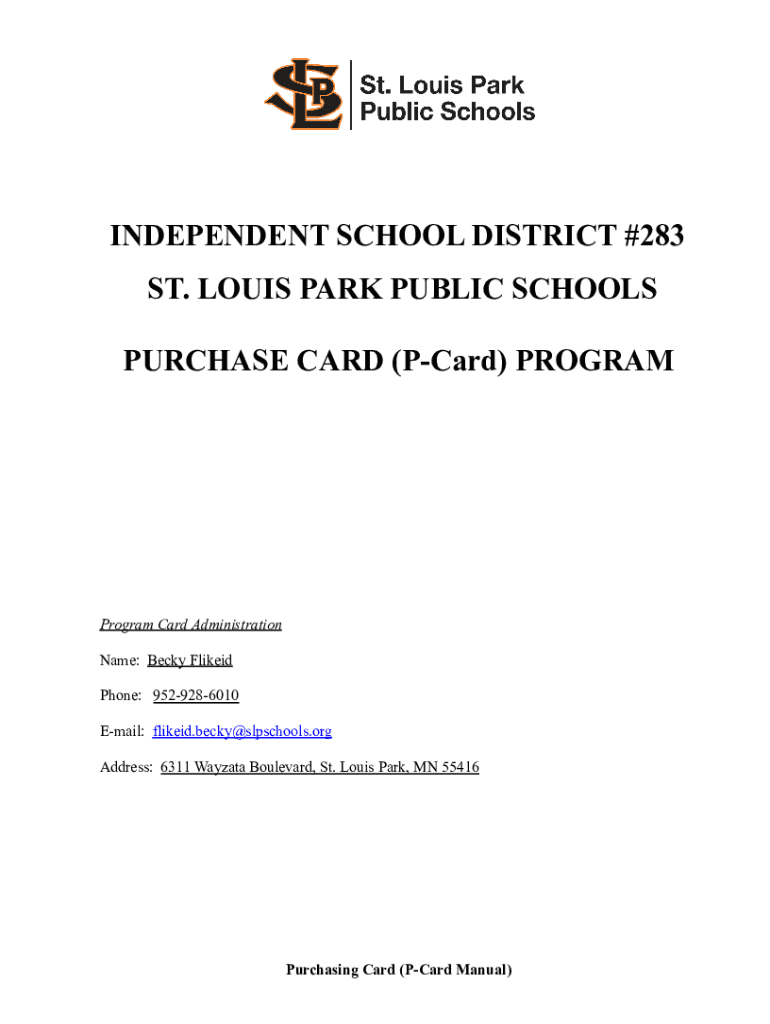 INDEPENDENT SCHOOL DISTRICT #283 ST. LOUIS PARK PUBLIC SCHOOLS PURCHASE CARD (PCard) PROGRAMProgram Card Administration Name: Becky Flikeid Phone: 9529286010 Email: flikeid.becky@slpschools.org Address: