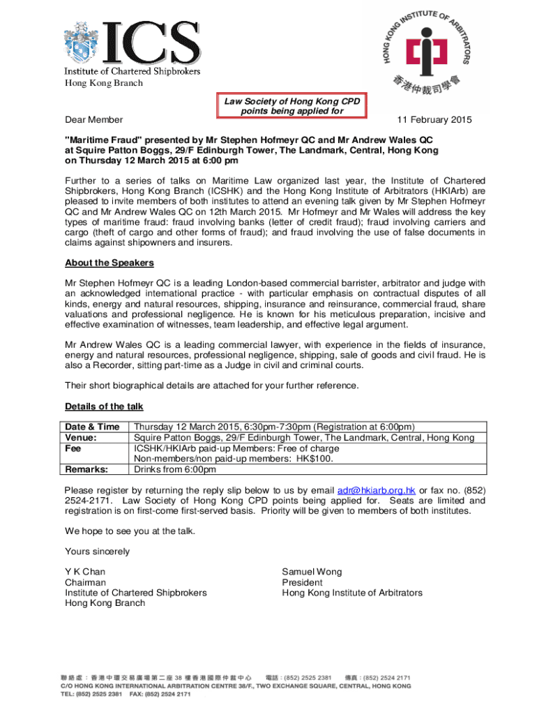Hong Kong Branch Law Society of Hong Kong CPD points being applied forDear Member11 February 2015\"Maritime Fraud\" presented by Mr Stephen Hofmeyr QC and Mr Andrew Wales QC at Squire Patton Boggs,