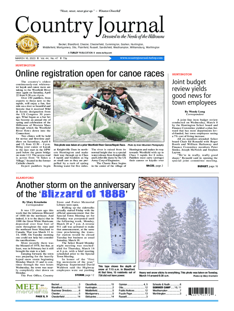 Never, never, never give up. Winston ChurchillRyearsONTU60LEDevoted to the Needs of the HilltownsEBR ATINSELGCCountry Journal Becket, Blandford, Chester, Chesterfield, Cummington, Goshen, Huntington,