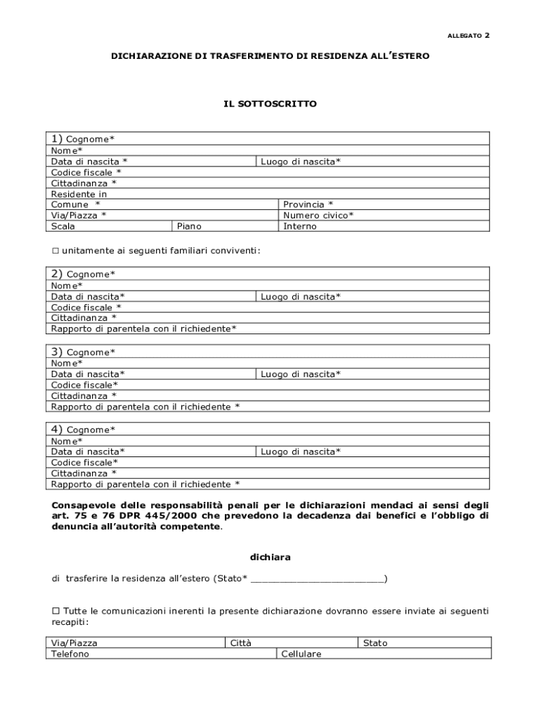 ALLEGATO2DICHIARAZIONE DI TRASFERIMENTO DI RESIDENZA ALLESTEROIL SOTTOSCRITTO1) Cognome* Nome* Data di nascita * Codice fiscale * Cittadinanza * Residente in Comune * Via/Piazza * ScalaLuogo di nascita*Provincia