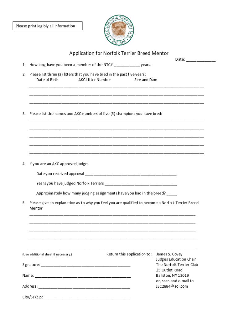 Please print legibly all informationApplication for Norfolk Terrier Breed Mentor 1. How long have you been a member of the NTC? ___ years.Date: ___2. Please list three (3) litters that you have bred