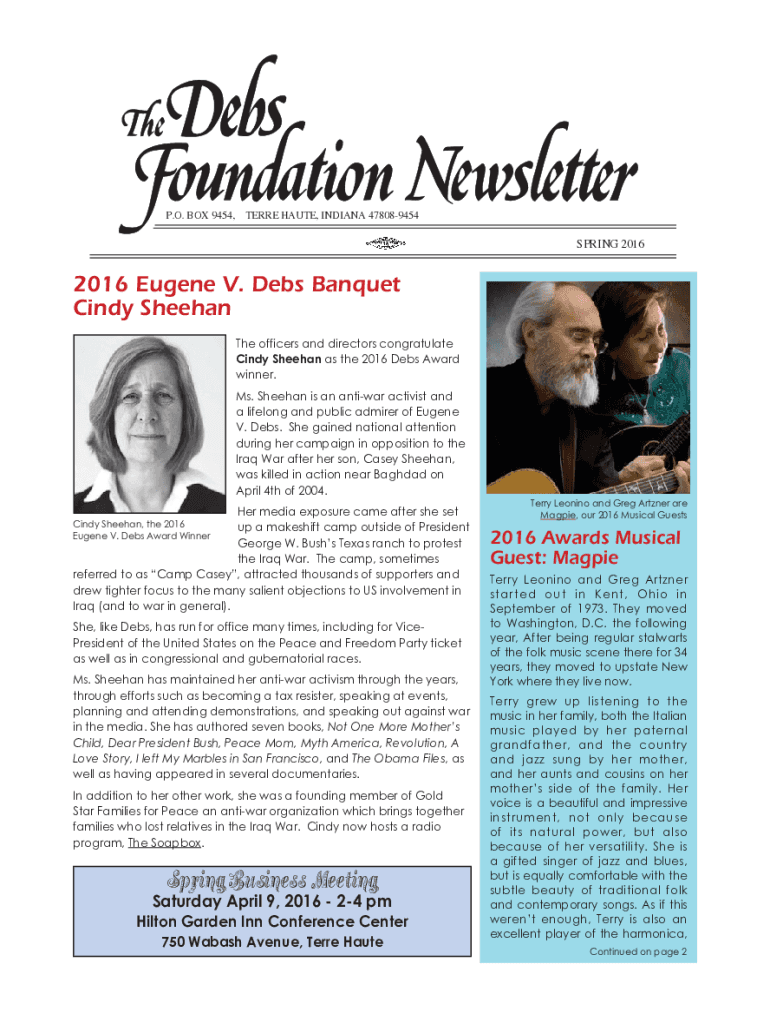 P.O. INDIANA 478089454 P.O.BOX9454, BOX 843, TERREHAUTE, TERRE HAUTE, INDIANA 47808SPRING 20162016 Eugene V. Debs Banquet Cindy Sheehan The officers and directors congratulate Cindy Sheehan as the
