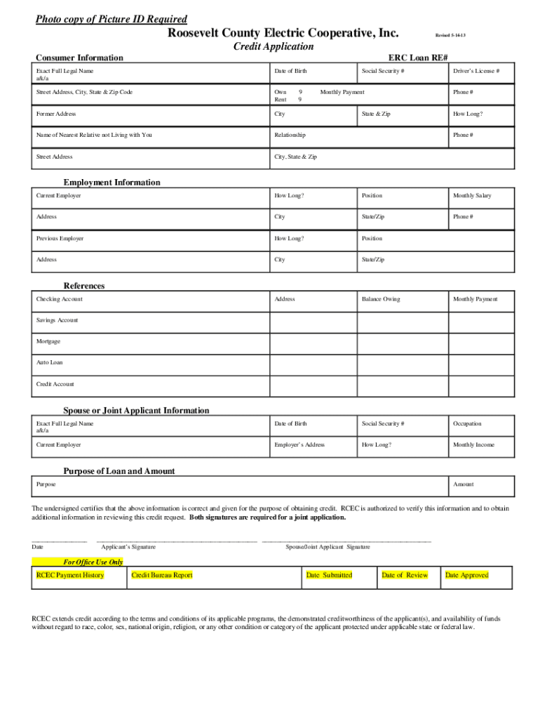 Photo copy of Picture ID RequiredRoosevelt County Electric Cooperative, Inc.Revised 51413Credit Application Consumer InformationERC Loan RE#Exact Full Legal Name a/k/aDate of BirthStreet Address,