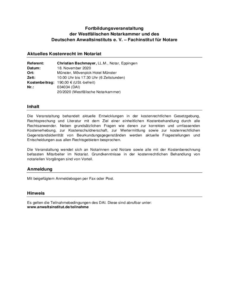 Fortbildungsveranstaltung der Westflischen Notarkammer und des Deutschen Anwaltsinstituts e. V. Fachinstitut fr Notare Aktuelles Kostenrecht im Notariat Referent: Datum: Ort: Zeit: Kostenbeitrag: