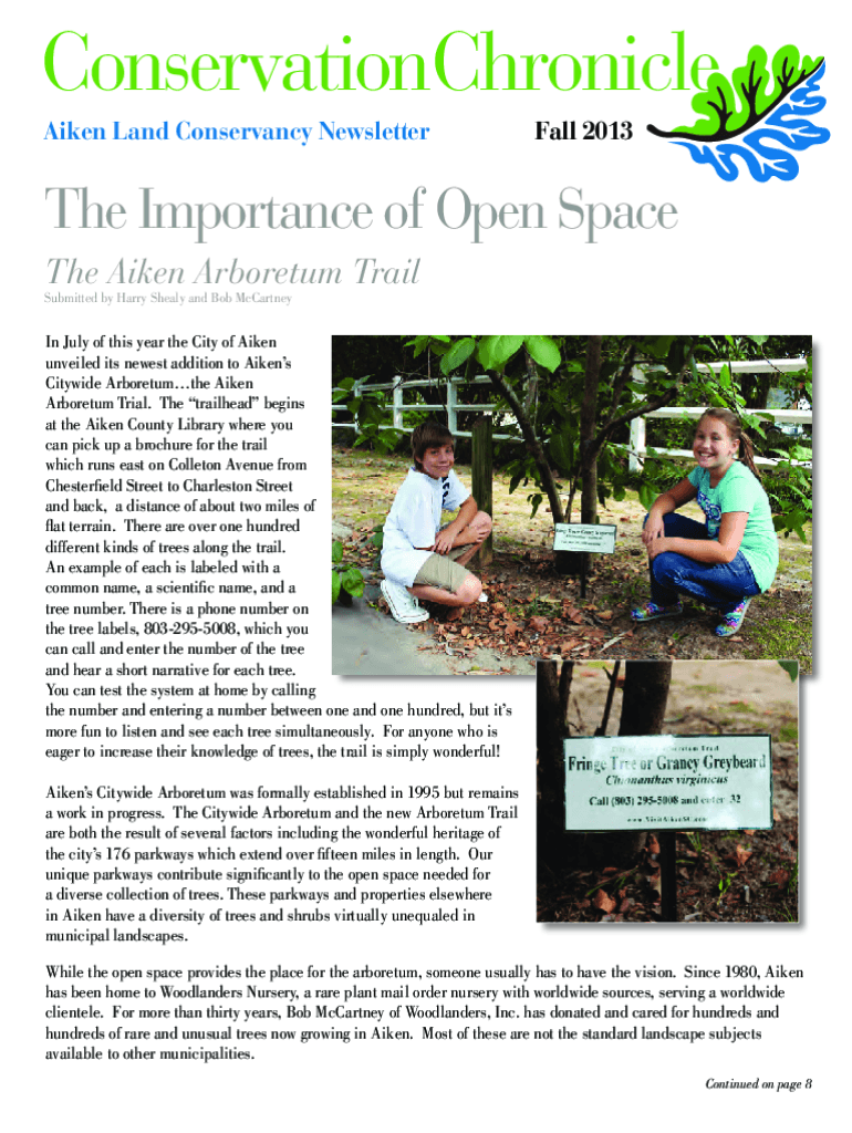 ConservationChronicle Aiken Land Conservancy NewsletterFall 2013The Importance of Open Space The Aiken Arboretum Trail Submitted by Harry Shealy and Bob McCartneyIn July of this year the City of Aiken