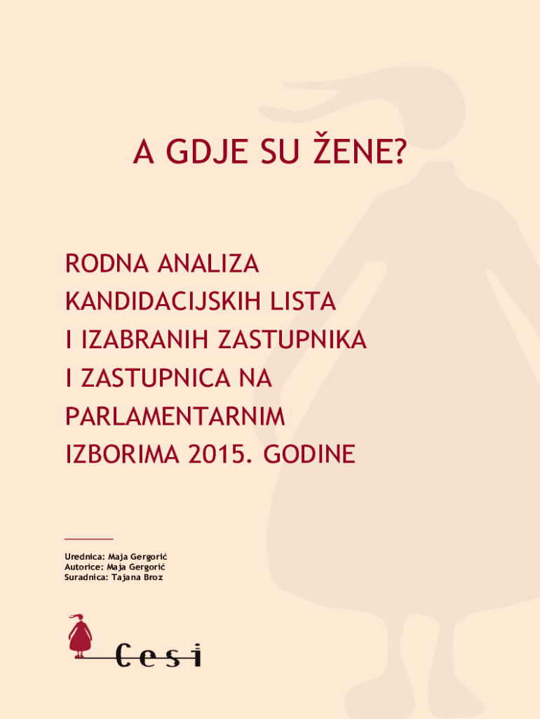 A GDJE SU ENE? RODNA ANALIZA KANDIDACIJSKIH LISTA I IZABRANIH ZASTUPNIKA I ZASTUPNICA NA PARLAMENTARNIM IZBORIMA 2015. GODINEUrednica: Maja Gergori Autorice: Maja Gergori Suradnica: Tajana BrozIMPRESSUM