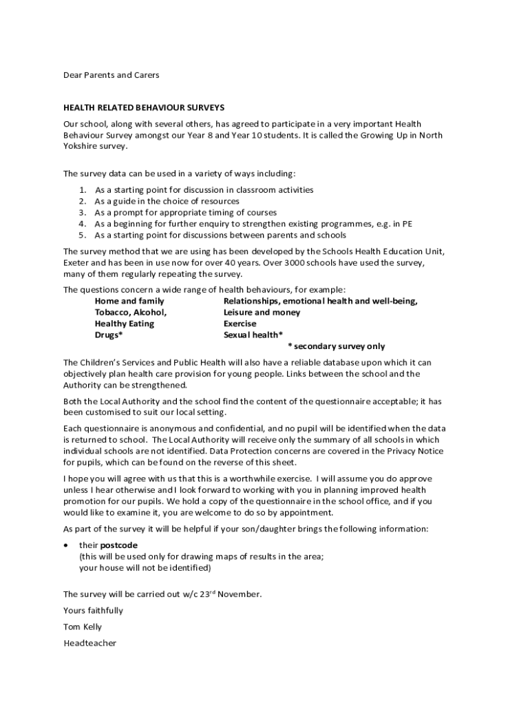 Dear Parents and CarersHEALTH RELATED BEHAVIOUR SURVEYS Our school, along with several others, has agreed to participate in a very important Health Behaviour Survey amongst our Year 8 and Year 10