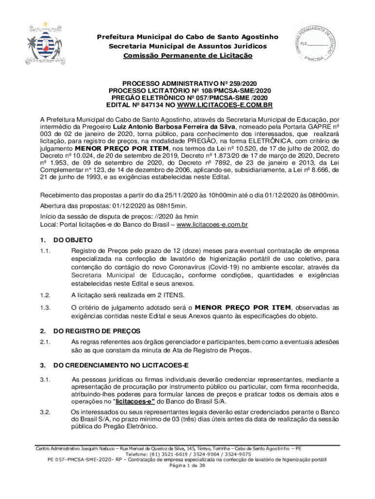 Prefeitura Municipal do Cabo de Santo Agostinho Secretaria Municipal de Assuntos Jurdicos Comisso Permanente de LicitaoPROCESSO ADMINISTRATIVO N 259/2020 PROCESSO LICITATRIO N 108/PMCSASME/2020 PREGO
