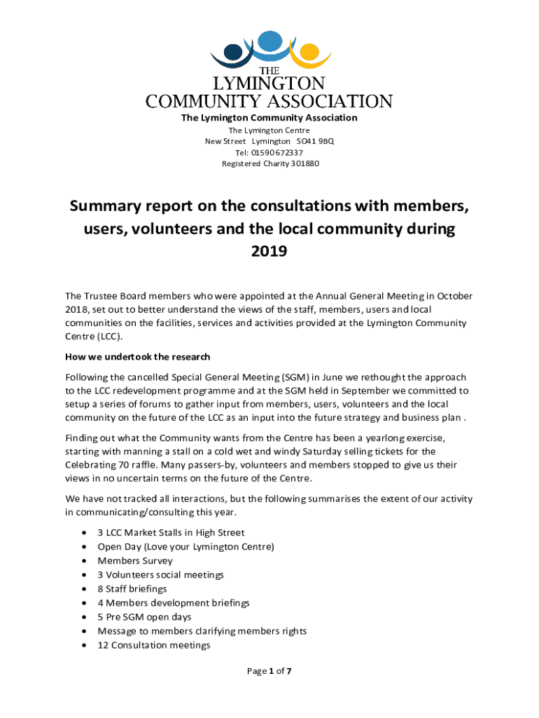 The Lymington Community Association The Lymington Centre New Street Lymington SO41 9BQ Tel: 01590 672337 Registered Charity 301880Summary report on the consultations with members, users, volunteers