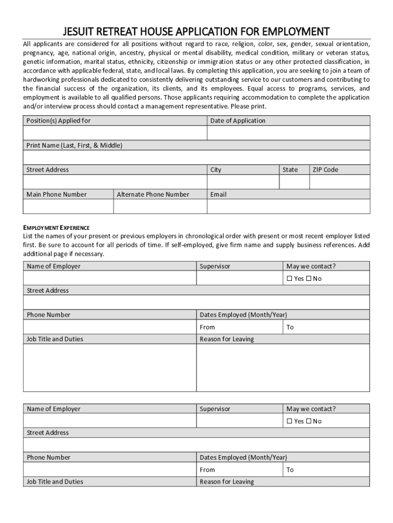 JESUIT RETREAT HOUSE APPLICATION FOR EMPLOYMENT All applicants are considered for all positions without regard to race, religion, color, sex, gender, sexual orientation, pregnancy, age, national origin,