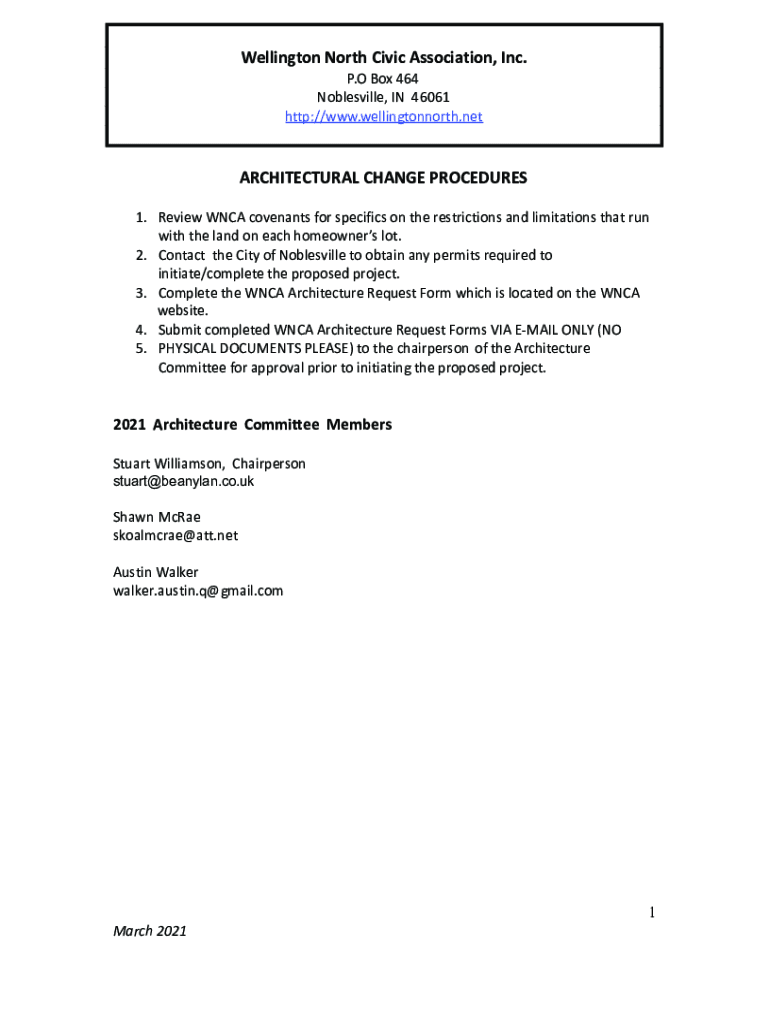 Wellington North Civic Association, Inc. P.O Box 464 Noblesville, IN 46061 http://www.wellingtonnorth.netARCHITECTURAL CHANGE PROCEDURES 1. Review WNCA covenants for specifics on the restrictions