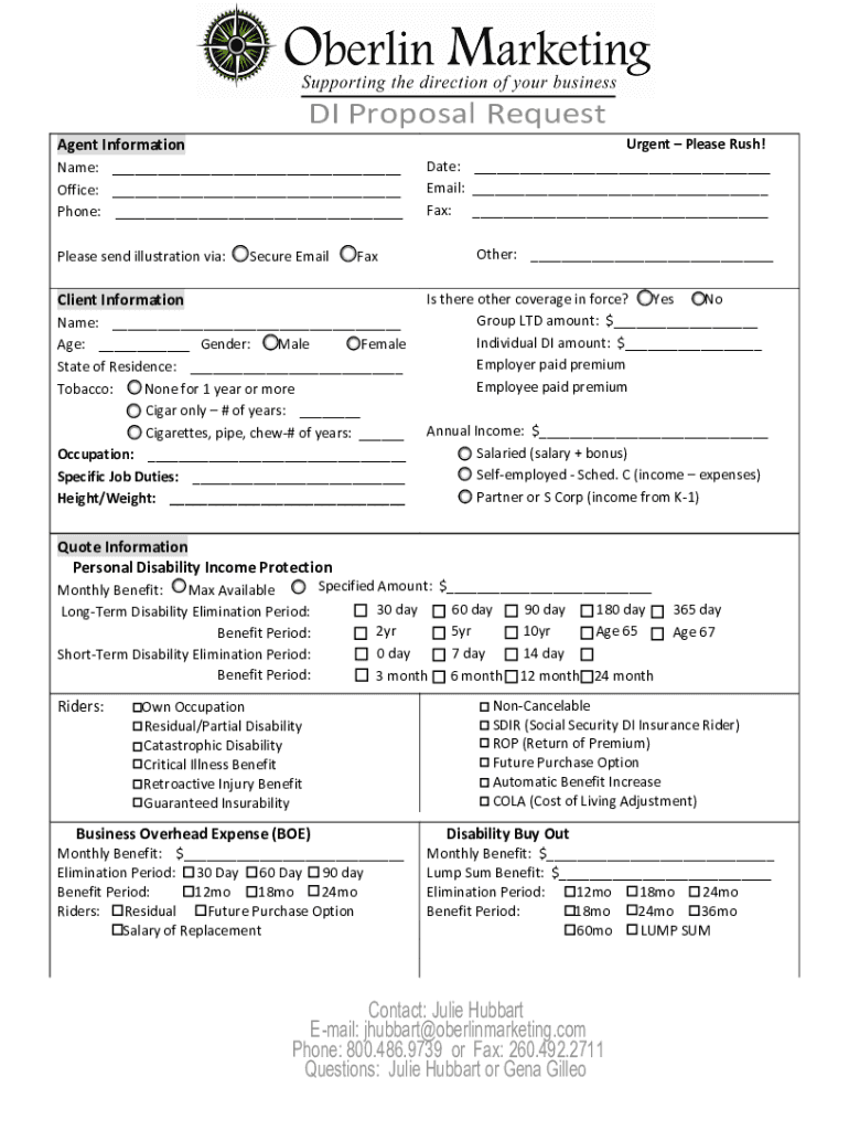 DI Proposal Request Agent Information Name: ___ Office: ___ Phone: ___ Please send illustration via:Secure EmailFaxClient Information Name: ___ Age: ___ Gender: Male Female State of Residence: ___