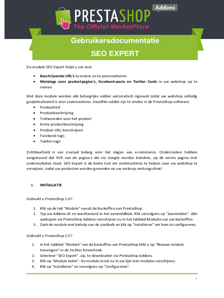 Gebruikersdocumentatie SEO EXPERT De module SEO Expert helpt u om snel: Beschrijvende URL\'s te maken en te personaliseren Metatags voor productpagina\'s, Facebookposts en Twitter Cards in uw webshop