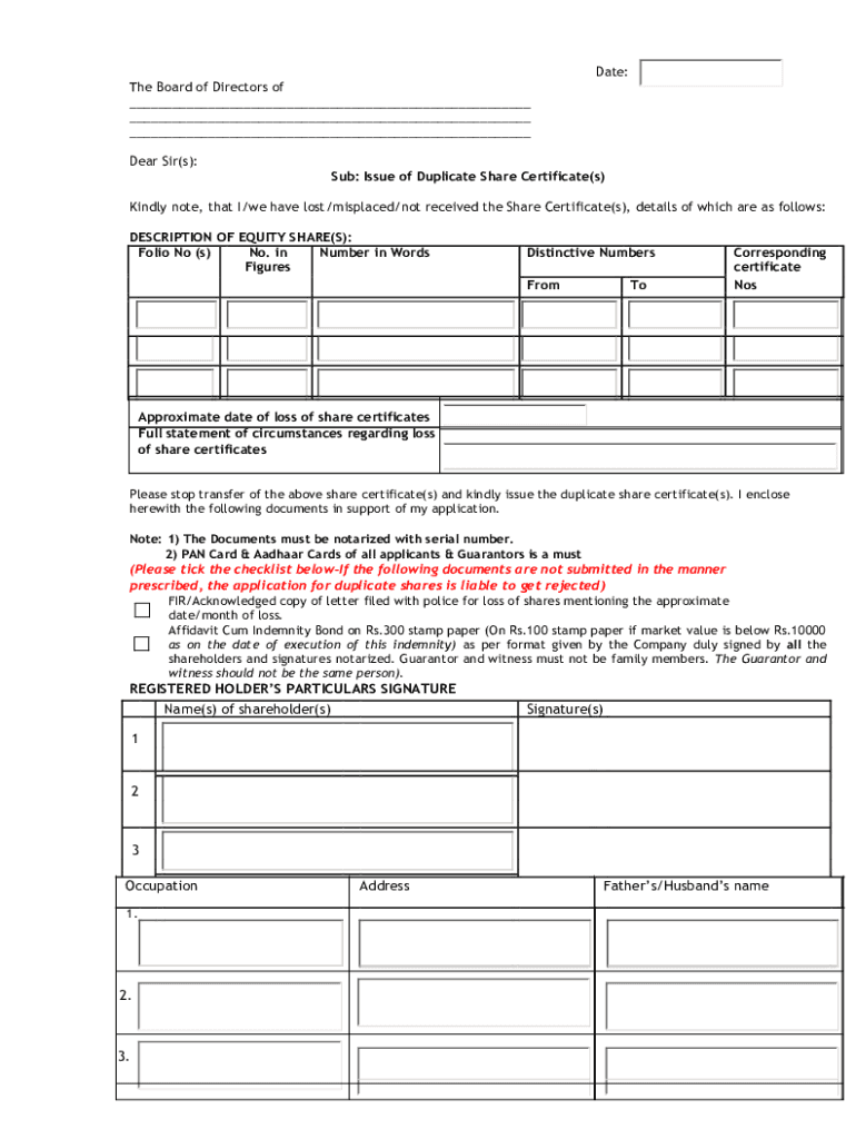 Date: The Board of Directors of ___ ___ ___ Dear Sir(s): Sub: Issue of Duplicate Share Certificate(s) Kindly note, that I/we have lost/misplaced/not received the Share Certificate(s), details of which