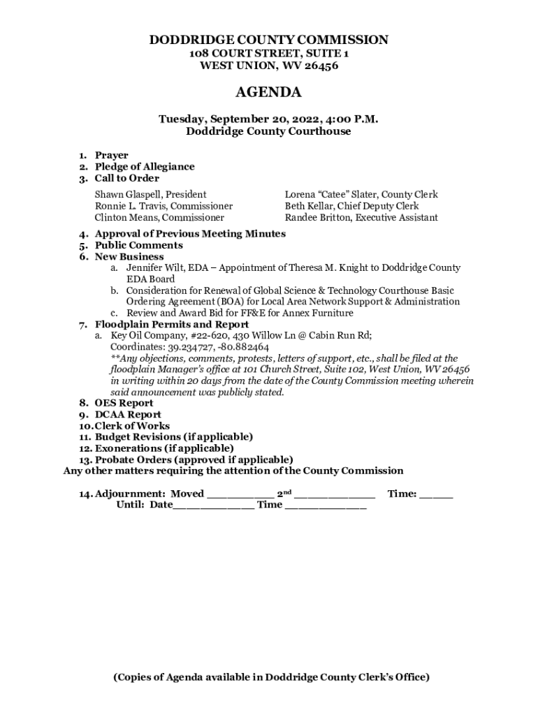 DODDRIDGE COUNTY COMMISSION 108 COURT STREET, SUITE 1 WEST UNION, WV 26456AGENDA Tuesday, September 20, 2022, 4:00 P.M. Doddridge County Courthouse 1. Prayer 2. Pledge of Allegiance 3. Call to Order