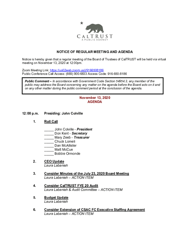 NOTICE OF REGULAR MEETING AND AGENDA Notice is hereby given that a regular meeting of the Board of Trustees of CalTRUST will be held via virtual meeting on November 13, 2020 at 12:00pm. Zoom Meeting
