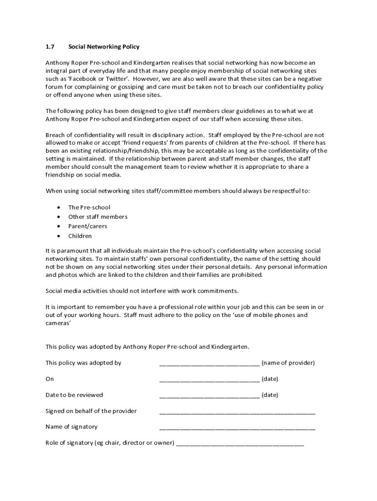 1.7Social Networking Policy Anthony Roper Preschool and Kindergarten realizes that social networking has now become an