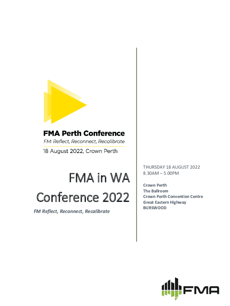 FMA in WA Conference 2022 FM Reflect, Reconnect, RecalibrateTHURSDAY 18 AUGUST 2022 8.30AM 5.00PM Crown Perth The Ballroom Crown Perth Convention Centre Great Eastern Highway BURSWOODSponsorship Opportunities
