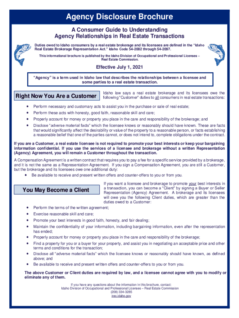 Effective July 1, 2012 Agency Disclosure BrochureA Consumer Guide to Understanding Agency Relationships in Real Estate Transactions Duties owed to Idaho consumers by a real estate brokerage and its